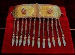 Из него также видно, что мастера в работе использовали разнообразные техники: гравировку, чеканку, штамповку, оксидирование и т.д. Для украшения брались различные самоцветы и драгоценные камни. При этом самыми популярными были геометрические, космогонические, зооморфные и растительные узоры.