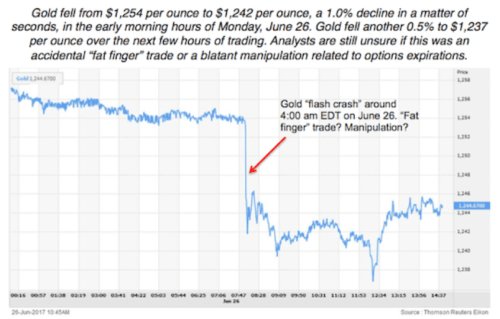 На рынке обсуждалось множество версий касательно истинных мотивов игрока, вызвавшего флэш-крэш на бумажном рынке золота. Был ли это так называемый “толстый палец,” то есть ошибка трейдера, неверно забившего цифры в компьютер или нажавшего не ту клавишу? Такое возможно, но на ум приходит другое гораздо более простое объяснение случившегося.