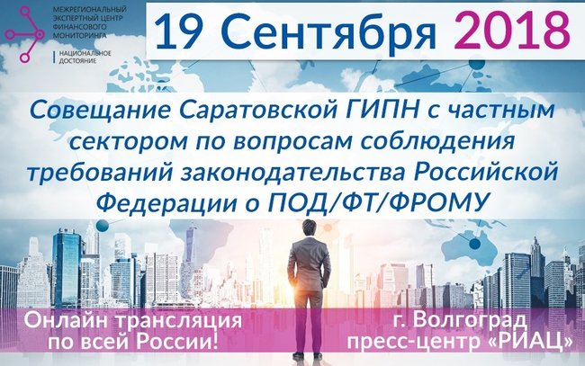 Саратовская Государственная инспекция пробирного надзора федерального казенного учреждения «Российская государственная пробирная палата при Министерстве финансов Российской Федерации» (далее – Саратовская Государственная инспекция пробирного надзора) приглашает организации и индивидуальных предпринимателей, поднадзорных Саратовской ГИПН, принять участие в совещании по вопросам соблюдения требований законодательства Российской Федерации о противодействии легализации (отмыванию) доходов, полученных преступным путем, и финансированию терроризма и распространения оружия массового уничтожения (далее по тексту – ПОД/ФТ/ФРОМУ), которое будет проходить (очно и онлайн) 19 сентября 2018 года в помещении пресс-центра «РИАЦ» по адресу: г. Волгоград, ул. Мира, д. 19А.