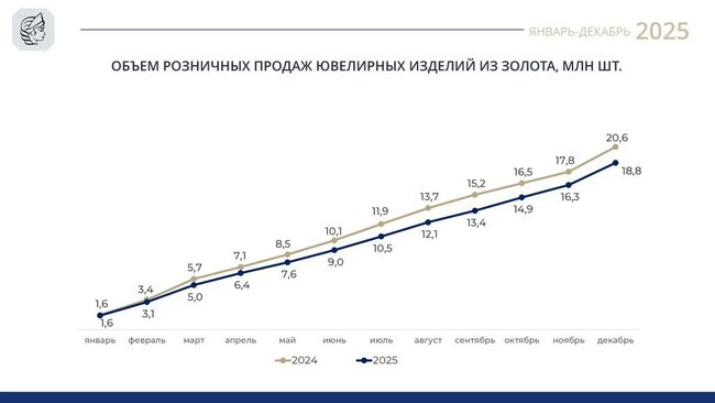 По итогам 2025 года объeм розничных продаж серебряных изделий достиг 49,7 млн штук, что на 1,1 млн штук больше, чем в 2024 году (48,6 млн штук). Годовой прирост составил 2,3%.