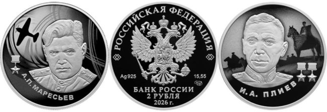 В обращение поступили памятные серебряные монеты номиналом 2 рубля серии «Герои Великой Отечественной войны 1941–1945 гг.», посвященные Иссе Александровичу Плиеву и Алексею Петровичу Маресьеву.