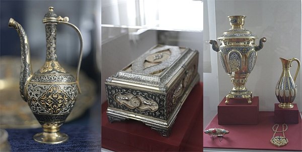 Неизменный интерес посетителей вызывали шкатулки работы Магомед-Расула Кишева, в которых сочетается разнообразная техника исполнения: глубокая гравировка, чернение, резьба по слоновой кости, позолота, они напоминают сказочные ларцы, наполненные таинственными сокровищами. Было представлено большое блюдо с многослойным богатым декором.