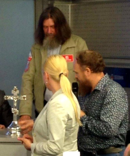 Костромской художник Олег Молчанов вручил сегодня Фeдору Конюхову крест-мощевик, изготовленный по его эскизу специально для кругосветного полета на воздушном шаре, в который известный путешественник отправится в середине июня.