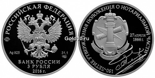 Банк России 31 мая 2016 года выпустил в обращение серебряную монету в честь 150-летия утверждения Положения о нотариальной части.