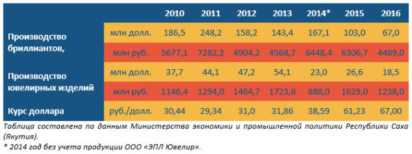 Таблица 1. Показатели производства алмазогранильной и ювелирной отраслей промышленности Республики Саха (Якутия) в 2010-2016 годах.