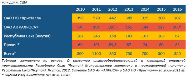 Данные показывают, что все крупные субъекты гранильной отрасли промышленности России начиная с 2011 года снижают свои показатели. Даже такой признанный лидер отрасли ОАО ПО «Кристалл» в 2016 году оказался в глубоком кризисе.