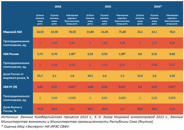 Таблица 3. Позиции алмазно-бриллиантового комплекса России и Республики Саха (Якутия) на мировом алмазном рынке в 2014-2016 годах.
