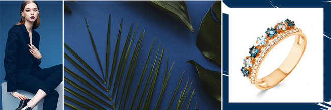 На вершине популярности сезона — бархатистый оттенок синего, который с легкостью заменит черный и графитовый в качестве классических. Костюм или плащ из синего полотна будет выигрышно смотреться с украшениями с дивными камнями: с сапфирами из коллекции Noir и с топазами из линейки Midnight.