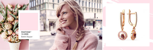 Нежно розовый оттенок с поэтическим названием «Балетная туфелька» украсит светловолосых девушек с весенним типом внешности. Блузу пастельного цвета дополнят чуть более яркие украшения, например, серьги с розовой эмалью, рубином и фианитами из коллекции Lady D или фантастическое кольцо с великолепными аметистами из коллекции Юберта.