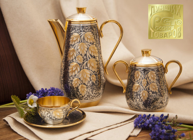 Кофейный набор «Хмель»: кофейник, сахарница, кофейная чашка и блюдце признаны Лауреатами Всероссийского конкурса и имеют право использовать золотой логотип конкурса Программы «100 лучших товаров России» в рекламных целях, размещать его в документации и на упаковке конкурсной продукции в течение 2-х лет.