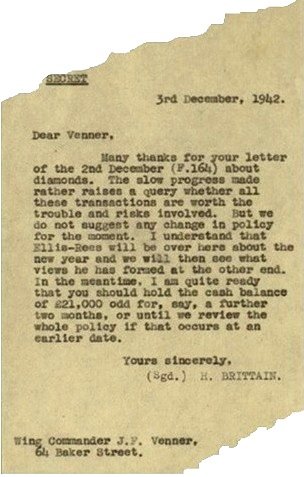 В составе SOE существовал отдел, возглавляемый неким Веннером (J.F. Venner), носившим звание Wing Commander (подполковник). На этот отдел возлагалась очень странная миссия: нужно было обеспечить финансирование резидентур и диверсионных групп SOE в оккупированных странах, за счет продажи алмазов на черных рынках этих стран за местную валюту. На первый взгляд, идея поражает своей нелепостью! Конечно, алмазов в Лондоне было очень много – в стоках «Де Бирс», и транспортировать этот товар с высокой удельной стоимостью было несложно. Но продажа алмазов на черных рынках оккупированных стран неизбежно влекла контакты с местным криминалом, наверняка нафаршированным агентами нацистских спецслужб и вероятность провала становилась близка к единице. Не безопасней ли было передавать повстанцам фунтовые или долларовые банкноты, которые пользовались большой популярностью во всех оккупированных странах и работать с которыми было несравненно проще, чем с алмазами, тем более что SOE не испытывало никаких проблем с финансированием?