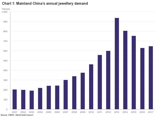Ювелирный рынок Китая является крупнейшим в мире, на его долю приходится 30% глобального спроса. Но этот рынок находится в состоянии изменения. Традиционно китайские потребители приобретали золотые ювелирные изделия чисто ради содержащегося в них золота. В настоящее время уделяется больше внимания украшениям, так как молодые потребители в частности присматриваются к золотым ювелирным украшениям как к средству выражения своей идентичности, получения социального признания и для разнообразия.