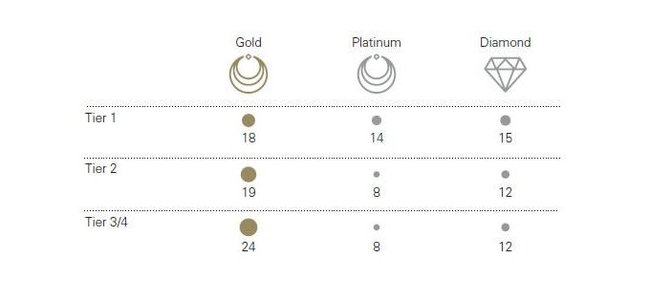 Gold - Золото, Platinum - Платина, Diamond - Бриллиант, Tier – Уровень.