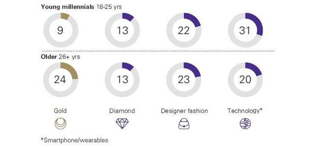 Young millennials 18-25 yrs - Молодые миллениалы в возрасте от 18 до 25лет.Older 26+ yrs – Более старшие в возрасте от 26 лет и выше.Gold - Золото.Diamond - Бриллиант.Designer fashion – Дизайнерский модный товар.Technology – Технологическое изделие.Smartphone/wearables – Смартфоны/портативные электронные устройства.