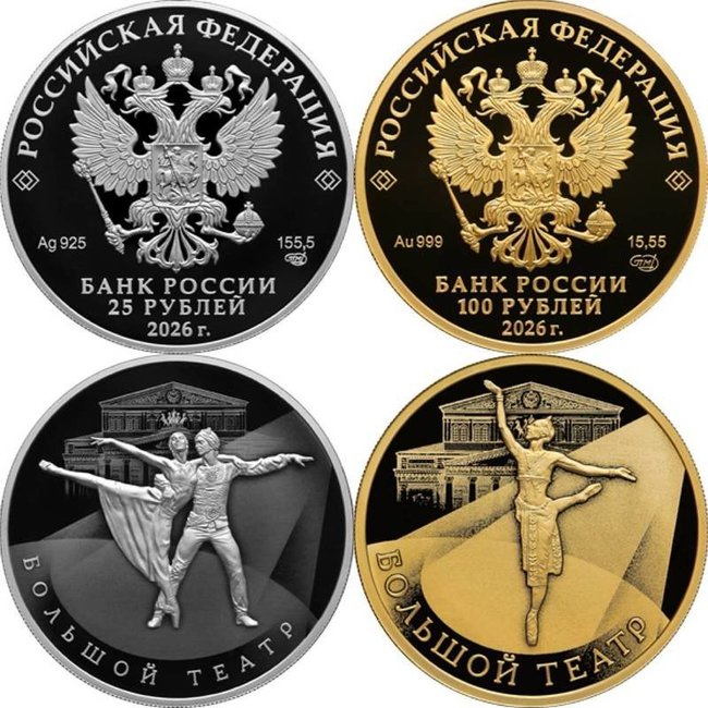 Памятные новинки номиналом 25 и 100 рублей из серебра и золота представил Центральный банк РФ. Монеты посвятили 250-летию Государственного академического Большого театра России и отчеканили на Санкт-Петербургском монетном дворе в серии «Исторические события».